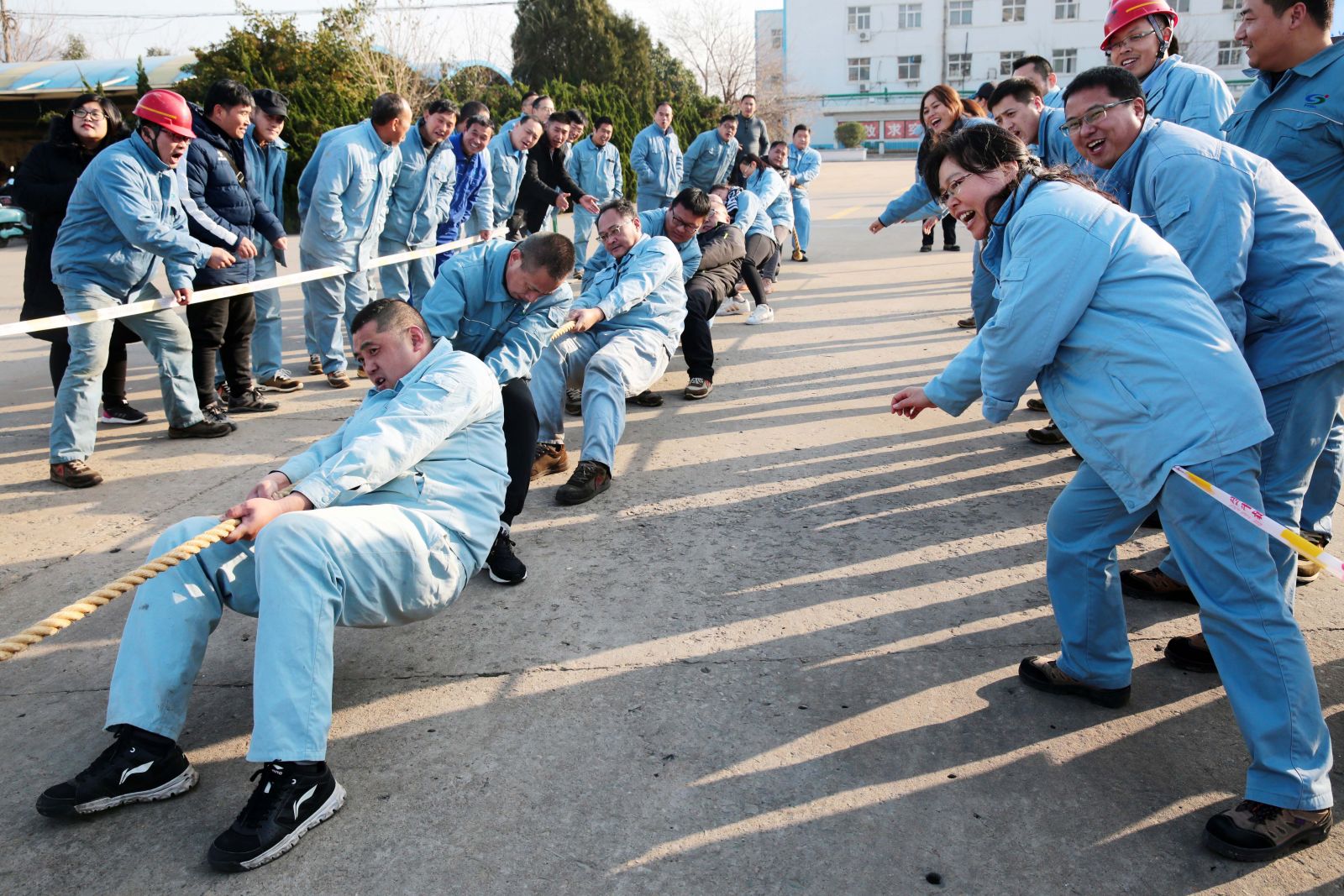 隨著裁判的一聲哨響,各名選手緊握繩索,咬緊牙關(guān),一觸即發(fā),彎腰、下蹲、跨步,后仰、發(fā)力,整個(gè)動(dòng)作整齊劃一,一氣呵成。未參賽的員工自發(fā)組成啦啦隊(duì)為比賽隊(duì)員助威,加油聲、吶喊聲、喝彩聲,此起彼伏,飄蕩在公司上空。