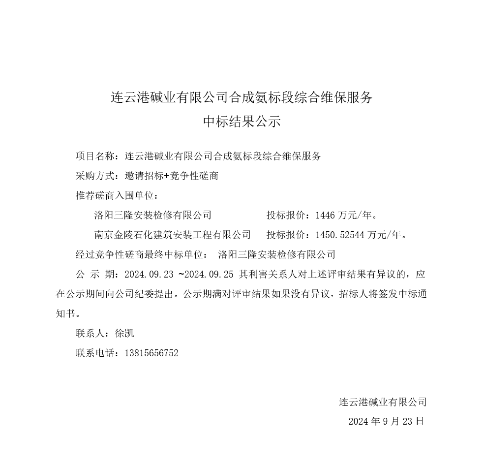 合成氨標段綜合維保服務中標結果公示